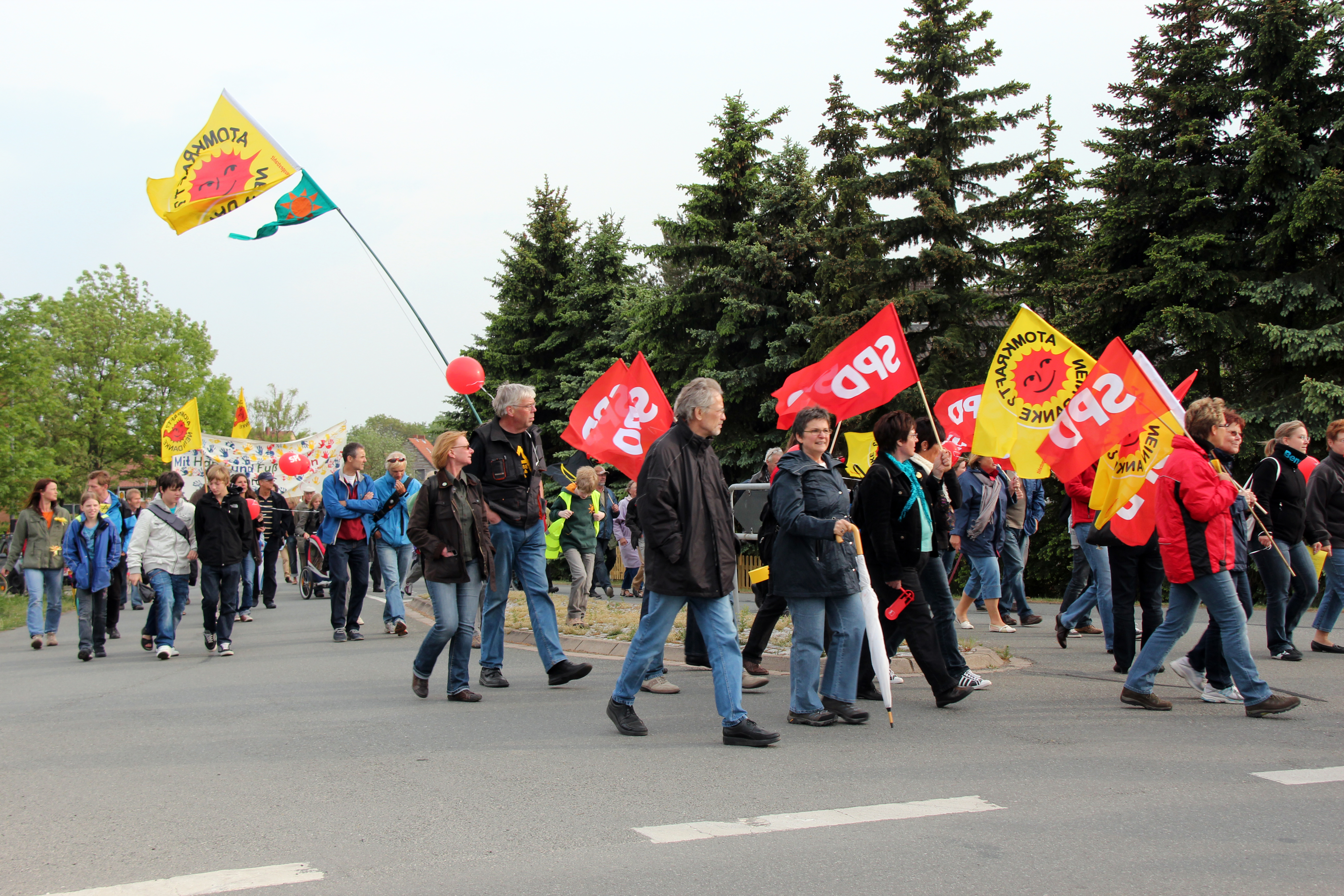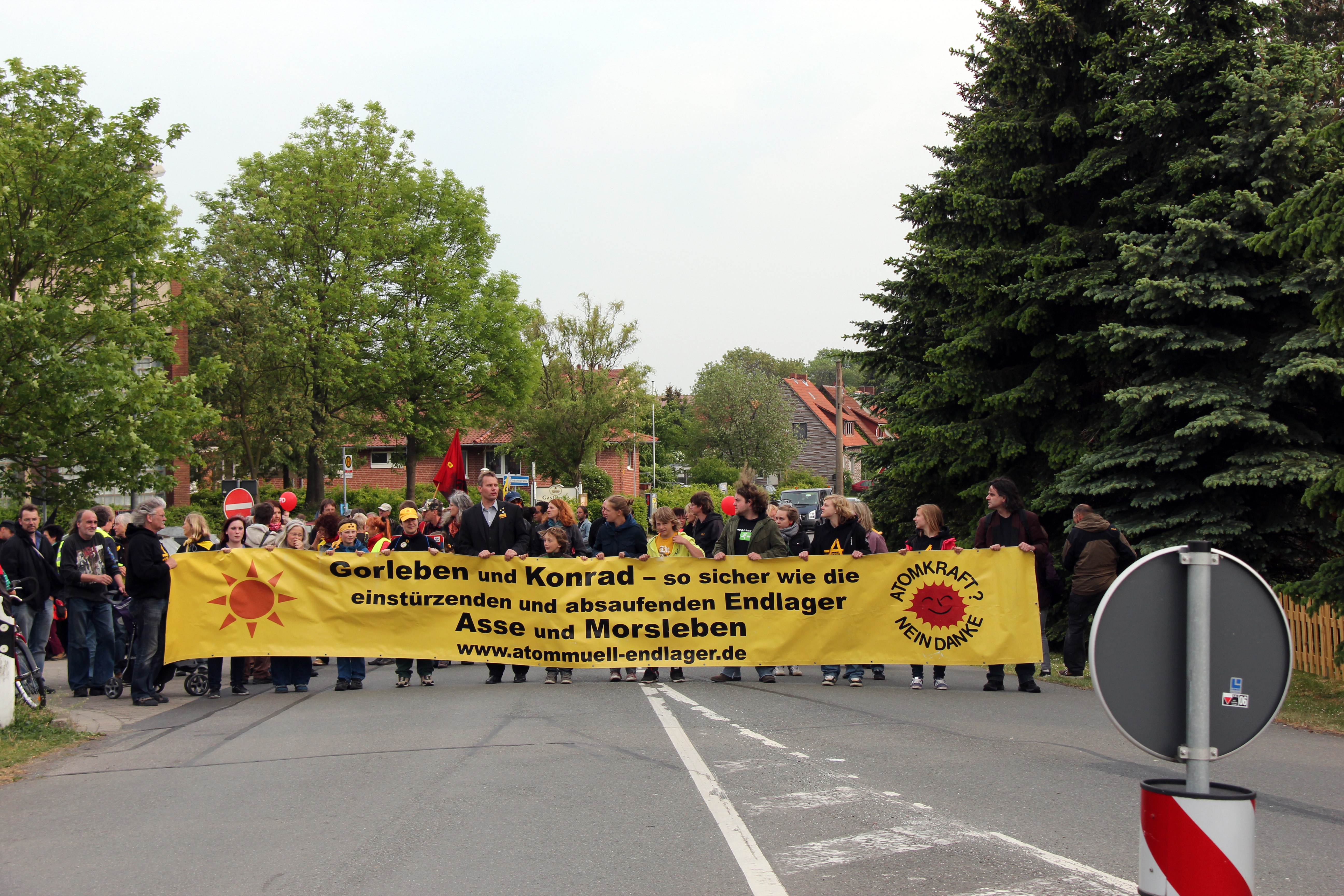 Beim Demozug mit mit ca. 400 Teilnehmer_innen liefen wir mit 7 bis 9 Leuten pro Reihe und "stauten" uns auf ca. 150 Metern Länge kurz vor der Schacht-Anlage (wir hatten für die Presse dort eine kurze Foto-Pause eingelegt). An der Schacht-Anlage selber wurden wir von weiteren "Asse-Aktivist_innen" erwartet. Im Laufe des Abends - je besser das Wetter wurde - sind aus den Dörfern und Städten im "Weltatomerbe Braunschweiger Land" noch weitere Interessierte gekommen, so dass wir von über 700 Bürger_innen ausgehen, die an der Veranstaltung teilnahmen.