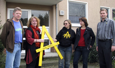 Hauswart Thorsten Hein (links) hat nach der Übergabe des A's geholfen, das Zeichen gut sichtbar an der Hausfront anzubringen.